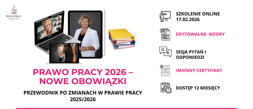 Dzień przed szkoleniem - 16.02.2026r. wyślemy mail z linkiem na platformę ZOOM, gdzie we wtorek 17.02.2026r. odbędzie się szkolenie. Wcześniej, bo już po zakupie na mail wysyłamy dane do logowania na platformę szkoleniową, gdzie dostępne będą wszystkie materiały (wzory, prezentacja i certyfikat oraz po szkoleniu jego nagranie) - ZACHOWAJ TEGO MAILA. W razie wątpliwości skontaktuj się z nami mailowo: prawopracyprzykawie@gmail.com